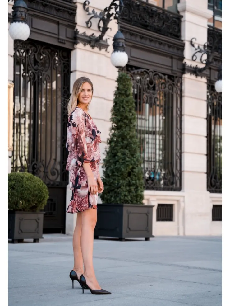 Vestido capeado asimétrico estampado de la marca «La Musa Woman». Manga 3/4. Escote redondo. Con forro. Fabricado en España.